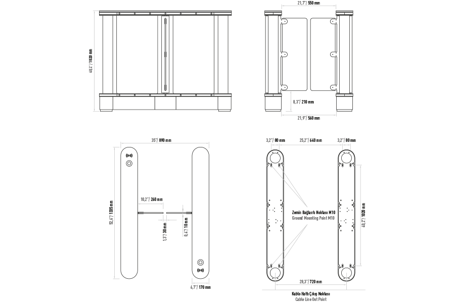 Fonksiyonlar : Mikroprossesör kontrol ile iki yönlü çalışma ve bir kişinin geçişine izin verme, elektronik geçiş hafıza özelliği ile bir geçiş tamamlamadan gelen diğer sinyalleri hafızaya alır ve kanatları kapatmadan geçişe izin verir. Ops: 2 adet RS232 ve 1 adet RS 485 haberleşme portu.